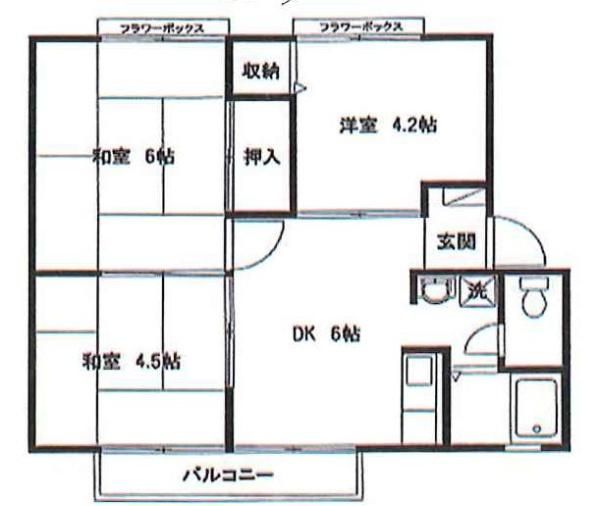 | 築年月 | 1990年8月 | 間取り | 3DK( 和室6畳/和室4.5畳/洋室4.2畳/DK6畳 ) | 専有面積 | 44.88m2 |